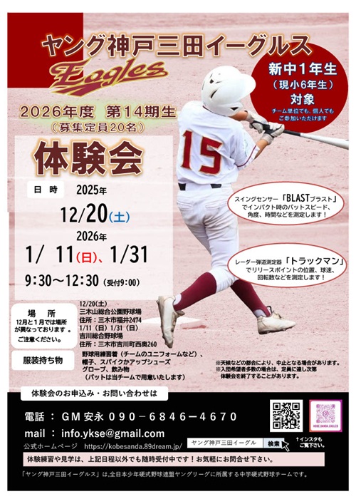 興味を持たれた方は、こちらからお気軽にお問合せください。新しい仲間があなたを待っています!未来のイーグルスの一員として、野球の楽しさを毎日体感し、新たな挑戦を共に始めましょう!